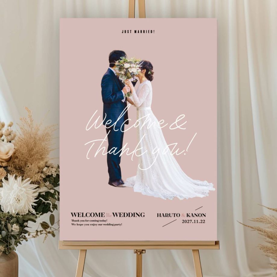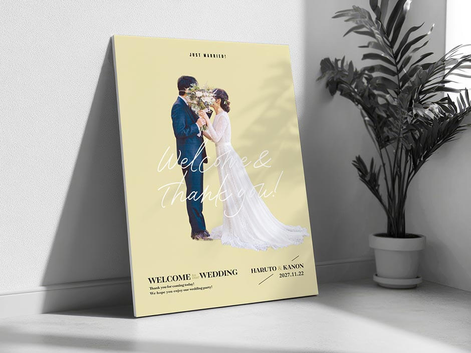 ウェルカムスペースに飾るアイテムの代表といえばウェルカムボード。二人に代わってゲストをお出迎えするウェルカムボードは写真で作るフォトウェルカムボードが人気。