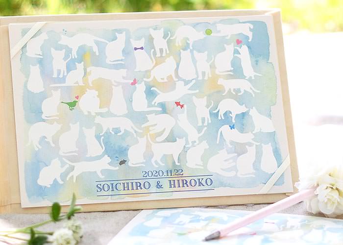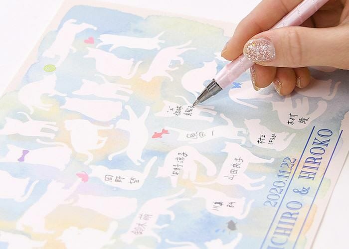 こちらは猫をデザインしたシートですが、他にもたくさんのデザインバリエーションがあります。パーティーのテーマにあわせて選ぶのもおすすめです。(→寄せ書き芳名帳を全部チェックしてみる)