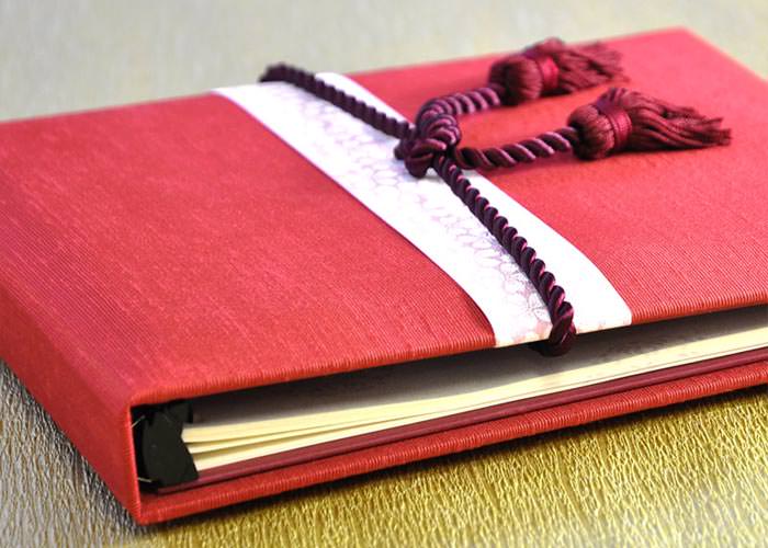 着物みたいなイメージのデザイン。紅色の布張りにピンクの桜柄の帯がアクセント。ワインレッドのフリンジ紐でひきしまった印象に。
