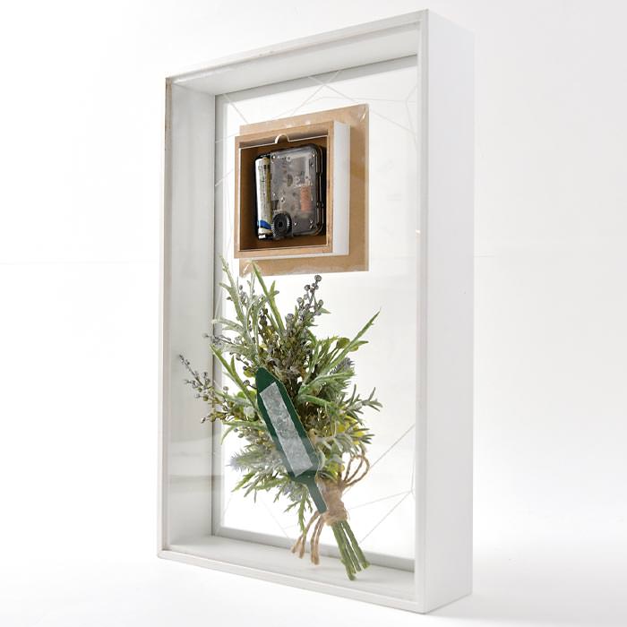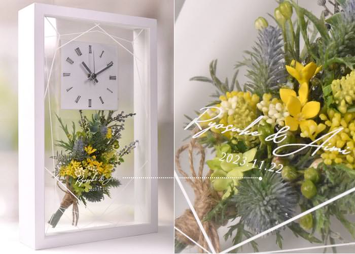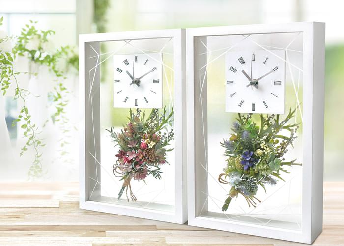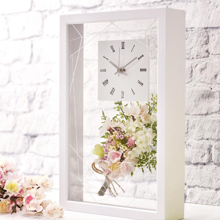 実用的なアイテムで人気が高い時計。クリアボックスにアーティフィシャルフラワーのブーケをとじこめた華やかなデザインは、結婚という節目に贈るのにふさわしい上質な贈り物です。
