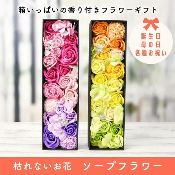 結婚のお祝いにぴったりな華やかさ。インテリアにもぴったりな香り付きフラワーをボックスの中にぎゅっと詰め込んだ、お花いっぱいのギフトです。実はこのお花は石けんでできたソープフラワー。贈りやすい価格帯ながらも、高見えするのがうれしいポイントです。ボックスの蓋部分には華やかなお花が見えるように、透明フィルムにメッセージが入れられます。