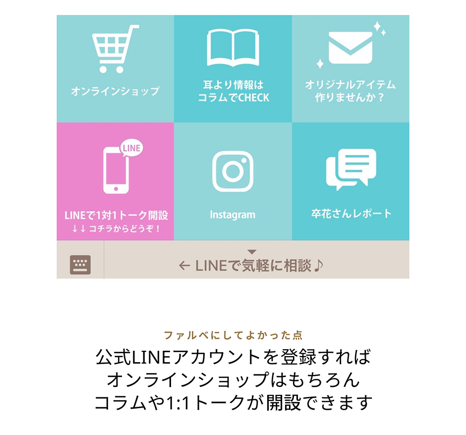 更に、FARBEの公式LINEアカウントを登録すれば、ワンタップでオンラインショップや、役立つコラム、1:1トークも開設できるんです。(→公式LINEアカウントはこちら)