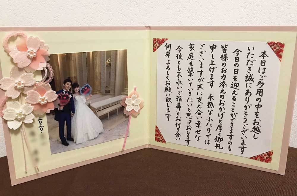 「感染症対策として除菌グッズを置き、来ていただいたお礼メッセージも書きました」とコロナ禍での結婚式でのゲストへのお心遣いもしっかりとされたお二人。とても達筆なお礼メッセージが素晴らしいです!手書き文字だとあたたかみもあり、気持ちがより伝わる気がします(*^_^*)