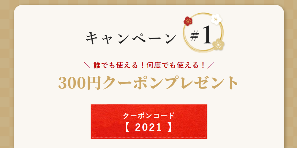 注文時に「クーポンコード」入力欄へ 2021 と入力していただくだけで