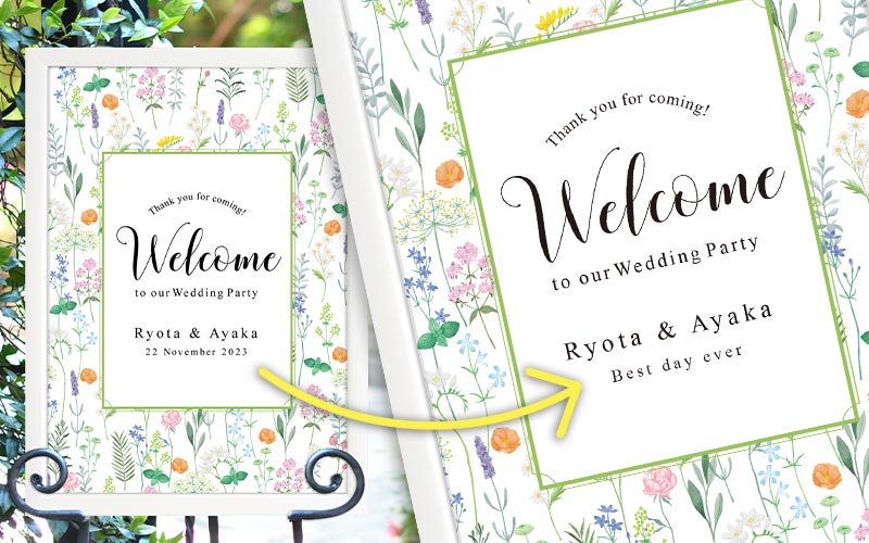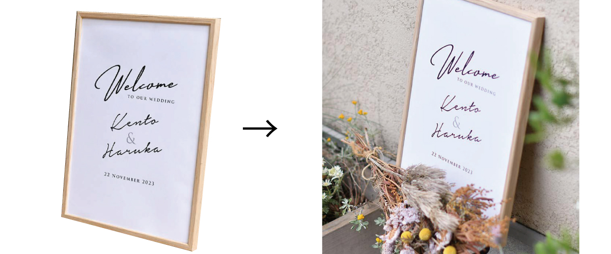 文字だけのシンプルなデザインは 生花やスワッグブーケなど お花をさっと近くに飾るだけでとってもお洒落なウェルカムボードになりますよ!
