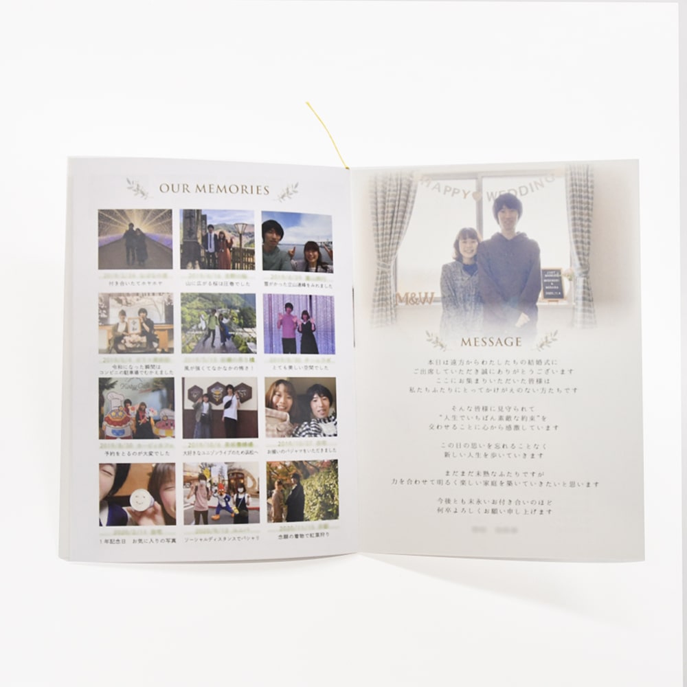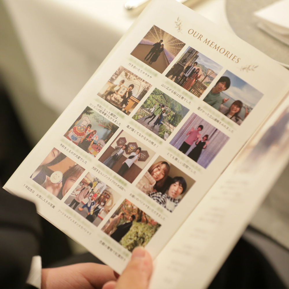 おふたりのプロフィールはもちろん、前撮りの写真を入れた写真集のようなものや席次表・メニュー表など内容が盛りだくさんなので、ファルベでも人気アイテム♪