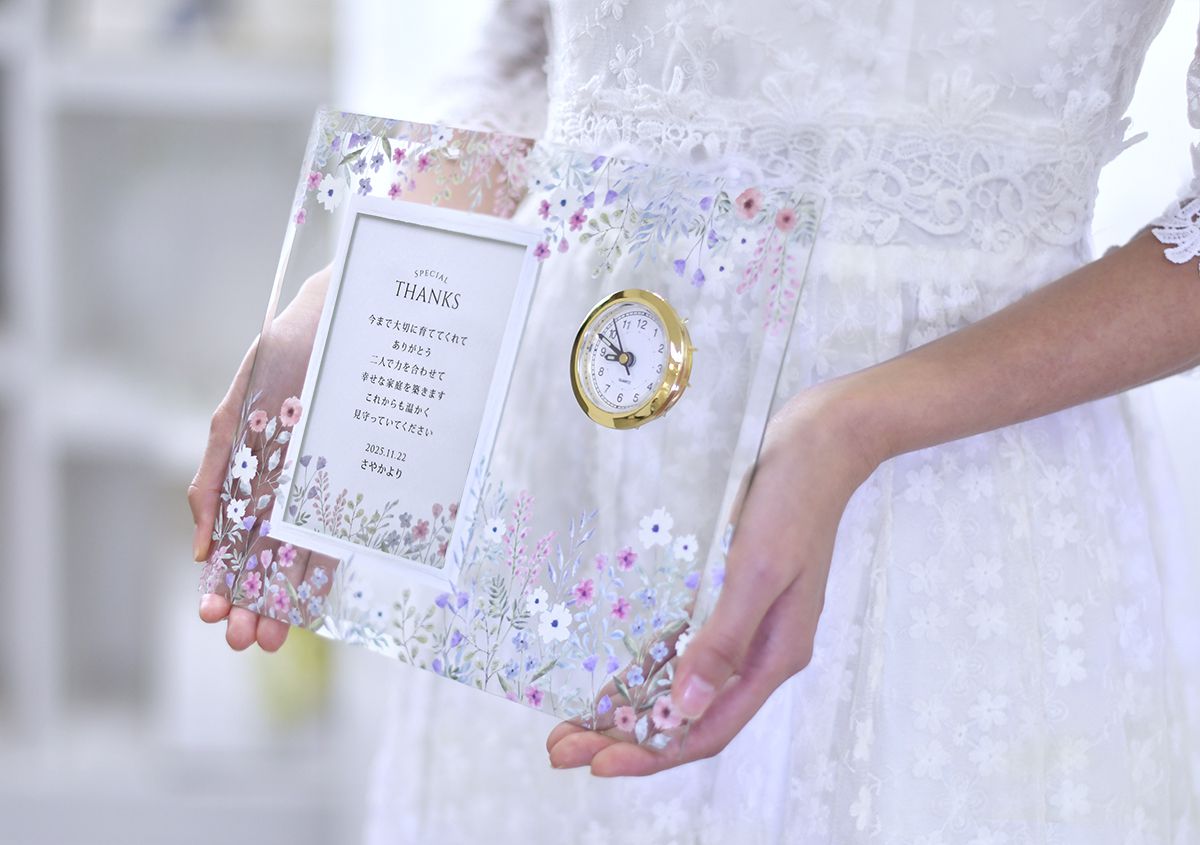 結婚式や前撮り写真など好きな写真を入れて飾ることができるので、ご両親様へのプレゼントだけではなく、お揃いで自分たちの記念用にもおすすめですよ!