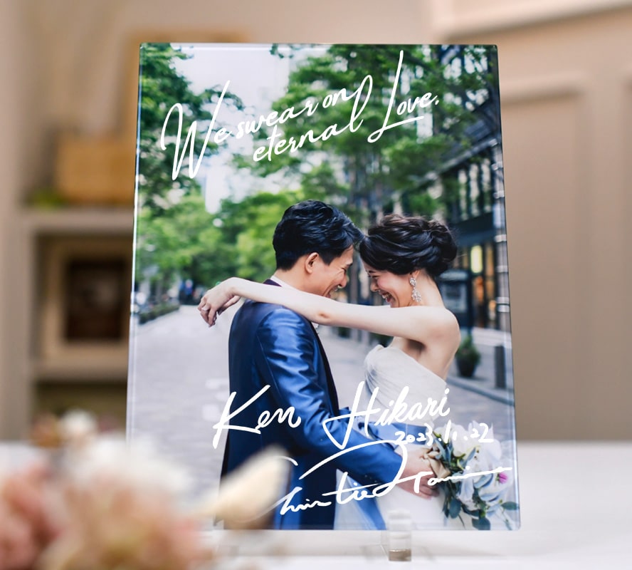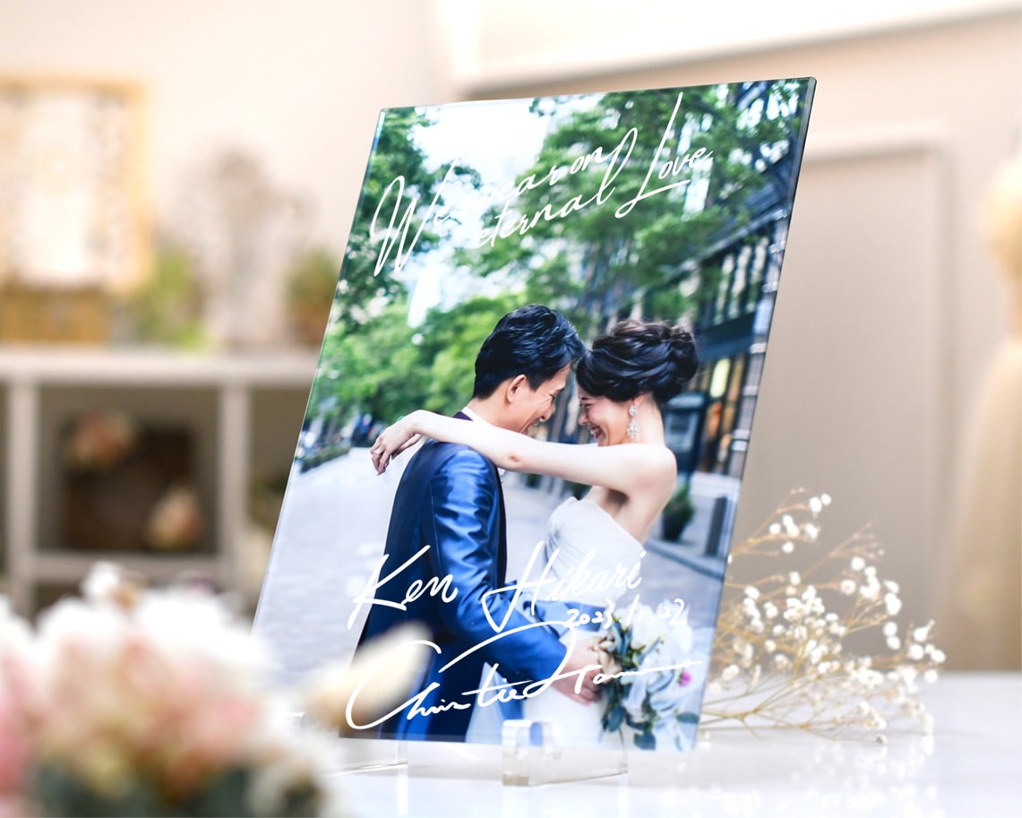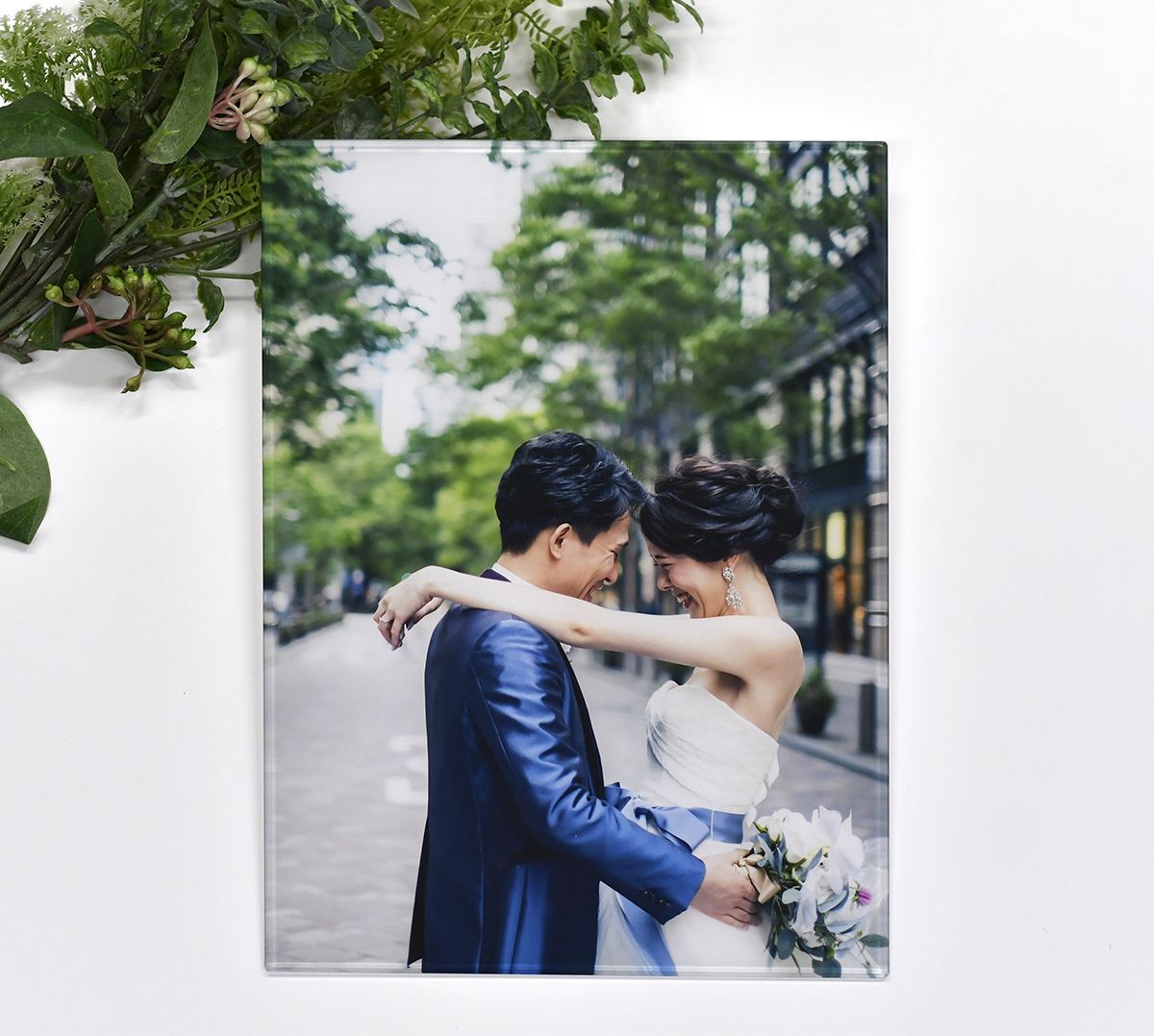 こちらは、お気に入りの前撮り写真をアクリルで仕上げたフォトプレートです。