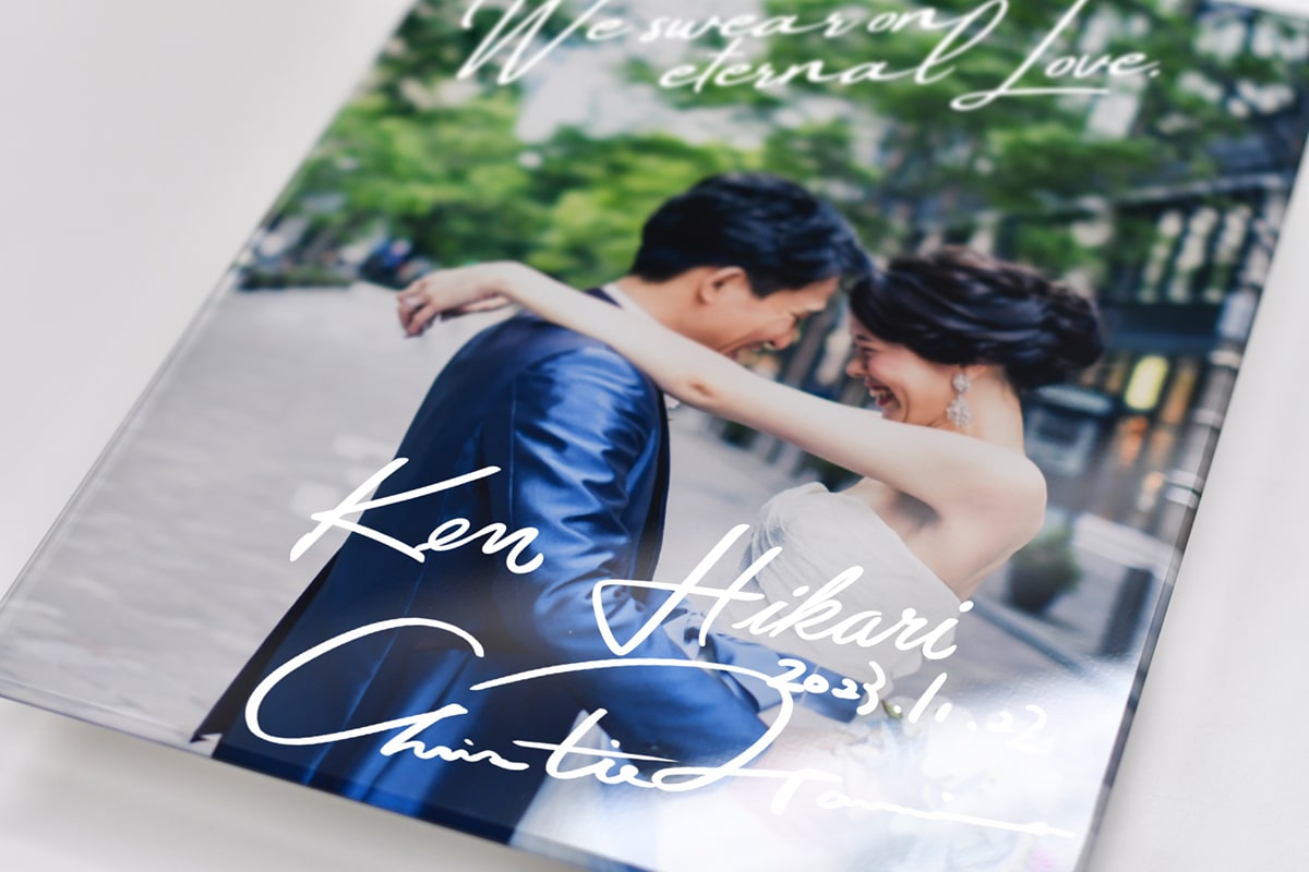 司式者様のサインでかっこよく仕上げてもらったり、あらかじめ「We swear on eternal love.」など英文を入れておくとよりお洒落に仕上がりそう。