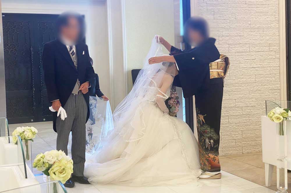 コロナ禍で2回延期しており、また再度延期するかどうか両親に何度も相談していたので、無事に挙げることができ、改めて両親のありがたみを感じることができ、ベールをおろしてもらい、ヴァージンロードを歩くことができ本当によかったです。