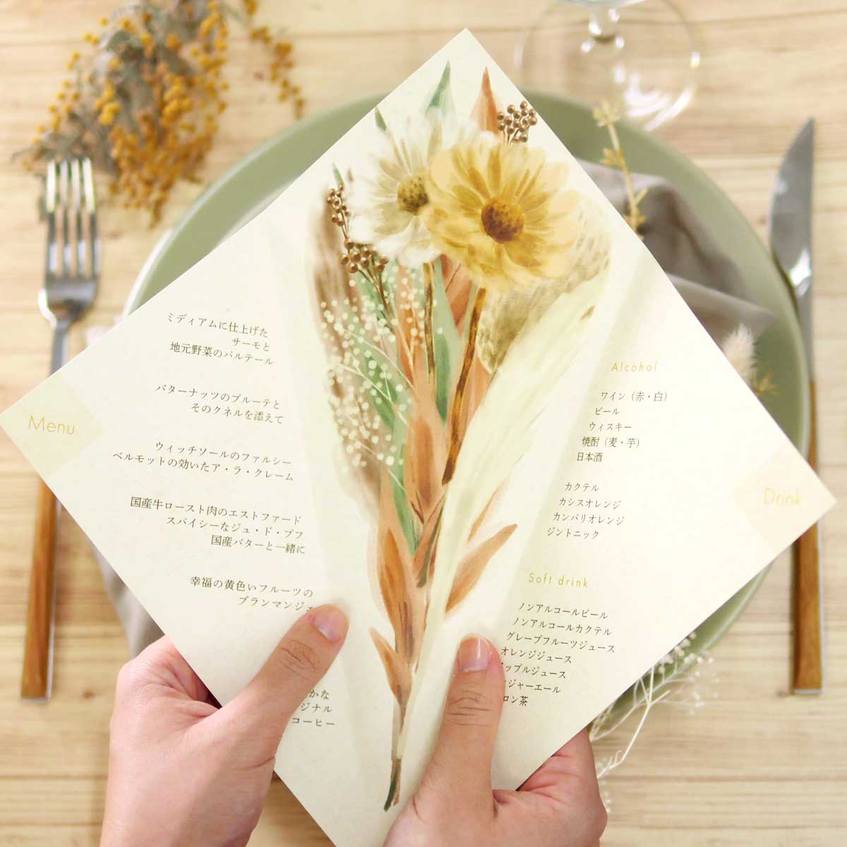 クラフトデザインのランチョンマット型のメニュー表も葉っぱとの組み合わせぴったり!