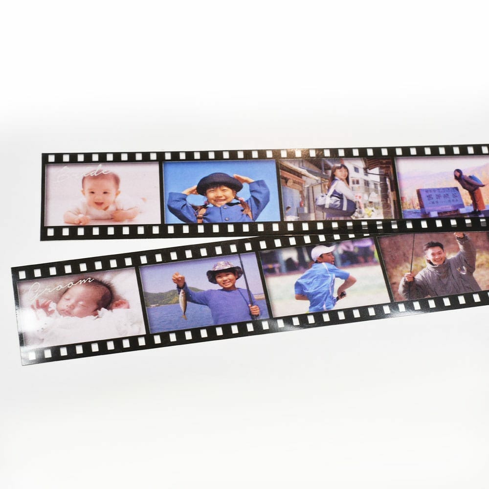 フィルムにはそれぞれ新郎(Groom)と新婦(Bride)と書いてあり、誕生~幼少~現在までを時系列にご紹介。
