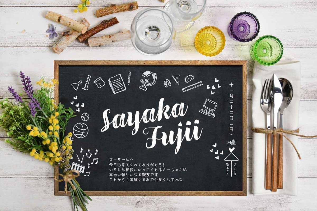 懐かしの日直に学校ならではの文具のイラストがカワイイ!フレーム部分を写真で再現することでまるで本物のような黒板風な仕上がり。