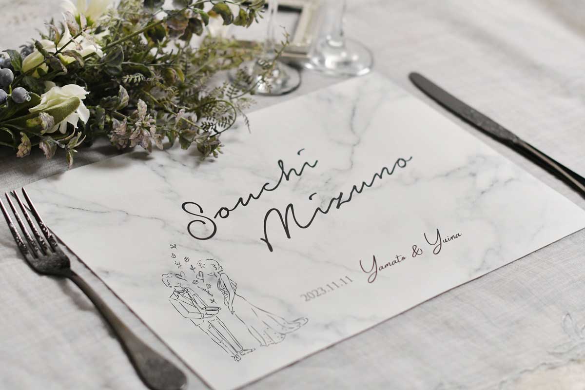 こちらは ペーパーランチョンマット席札デザインC【大理石風】にイラストを追加した例♡