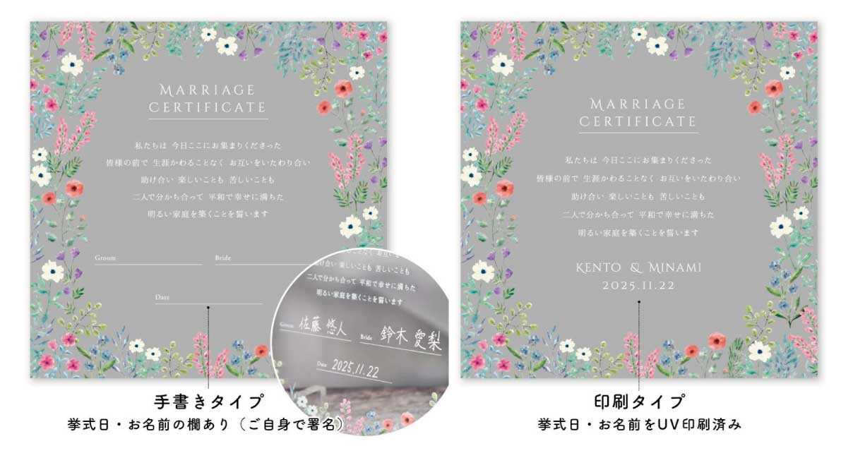 ■白文字ではっきり読めるUV印刷の結婚証明書