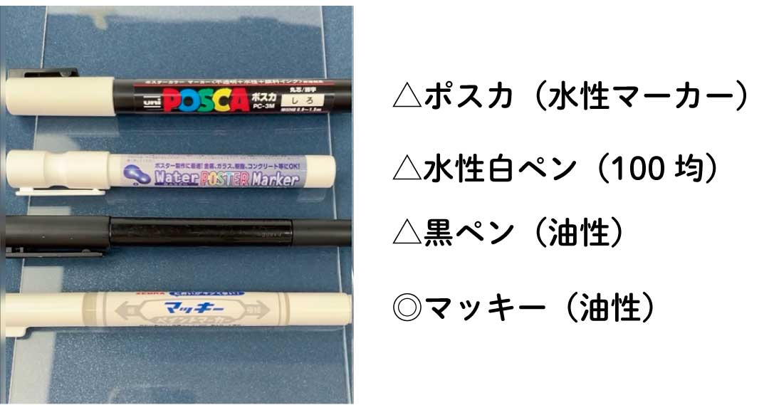 種類はマッキーじゃなくても良いですが、油性ペンがおすすめです。水性ペンは拭いたりすると文字が消えたりするので△