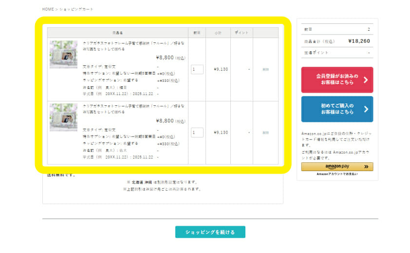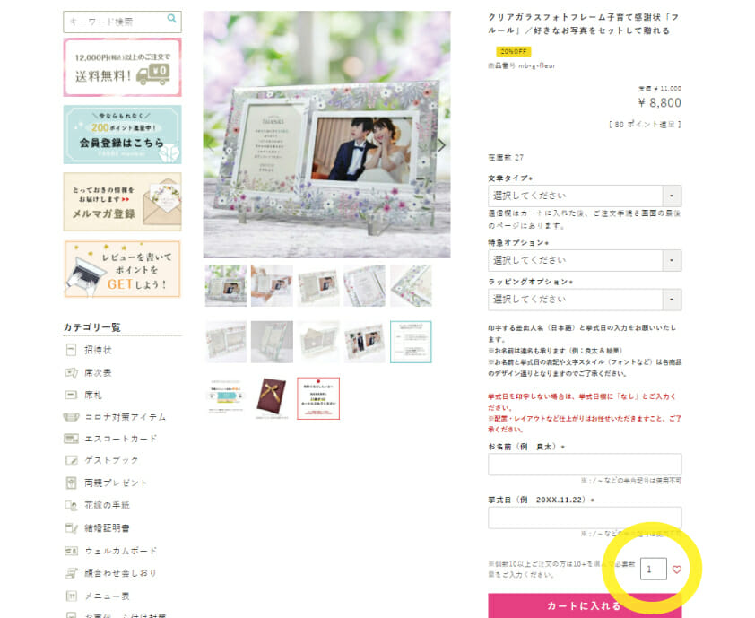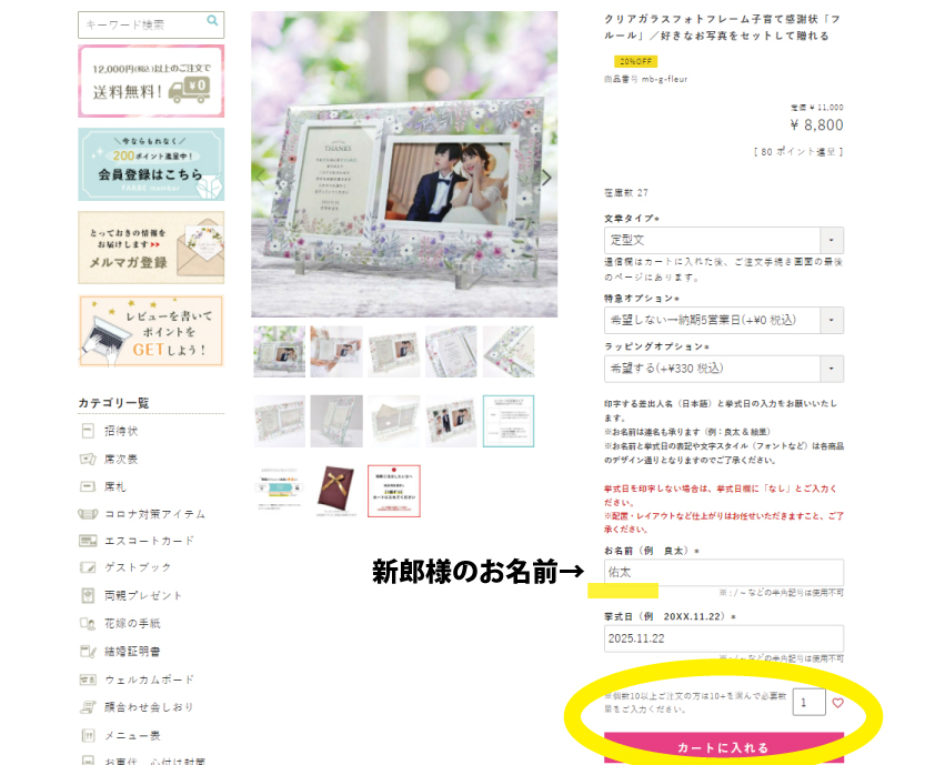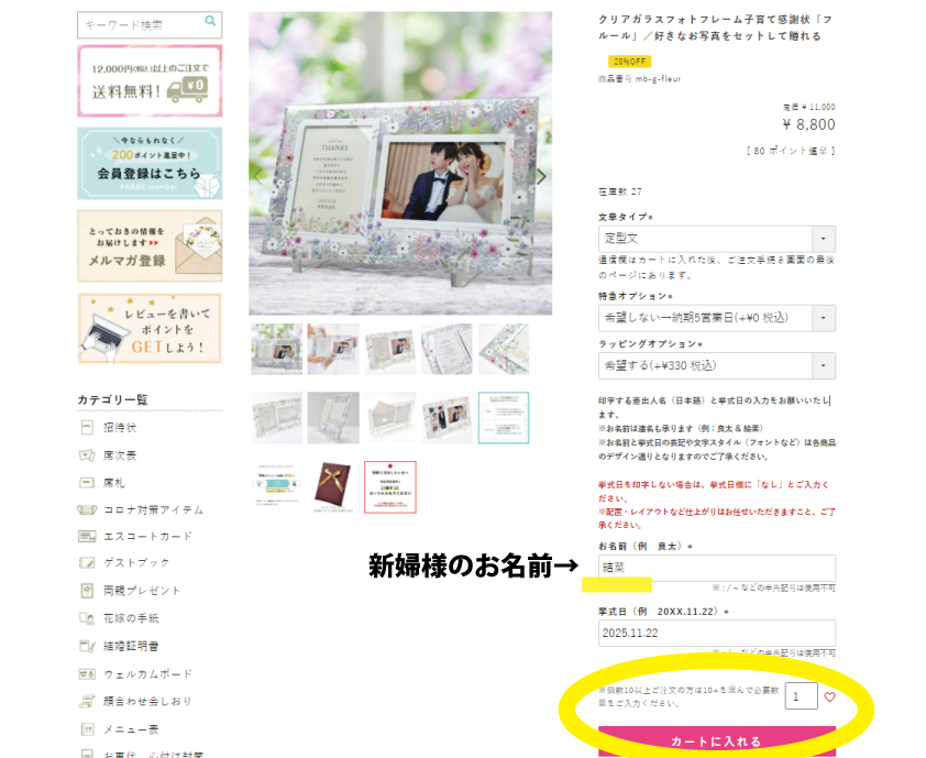 そうしたら、2つ目(新婦様用)の内容で、数量「1」でカ選択・入力してカートに入れましょう!