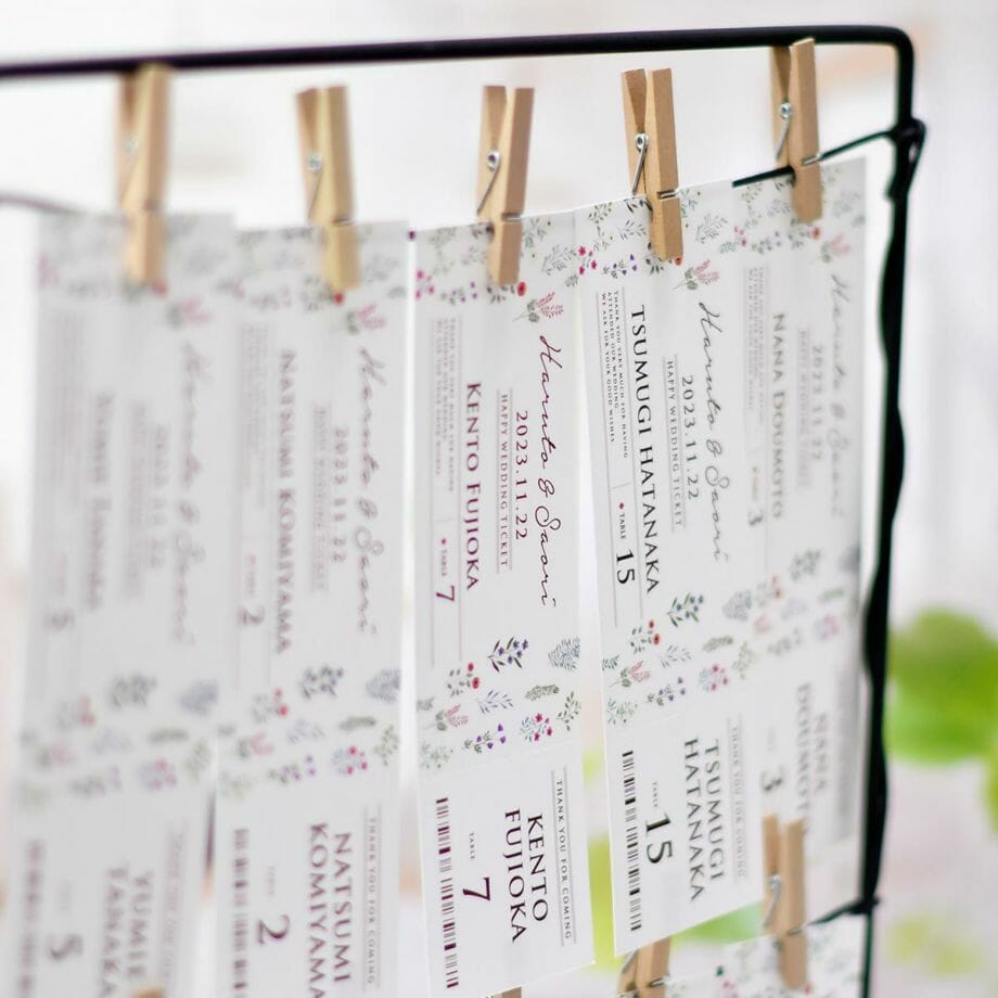 ミシン目入の半券タイプなので 披露宴会場に入る時に半券を渡して本物の入場チケットのように使ってもらえます。