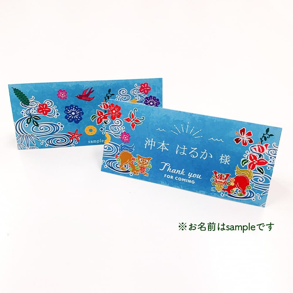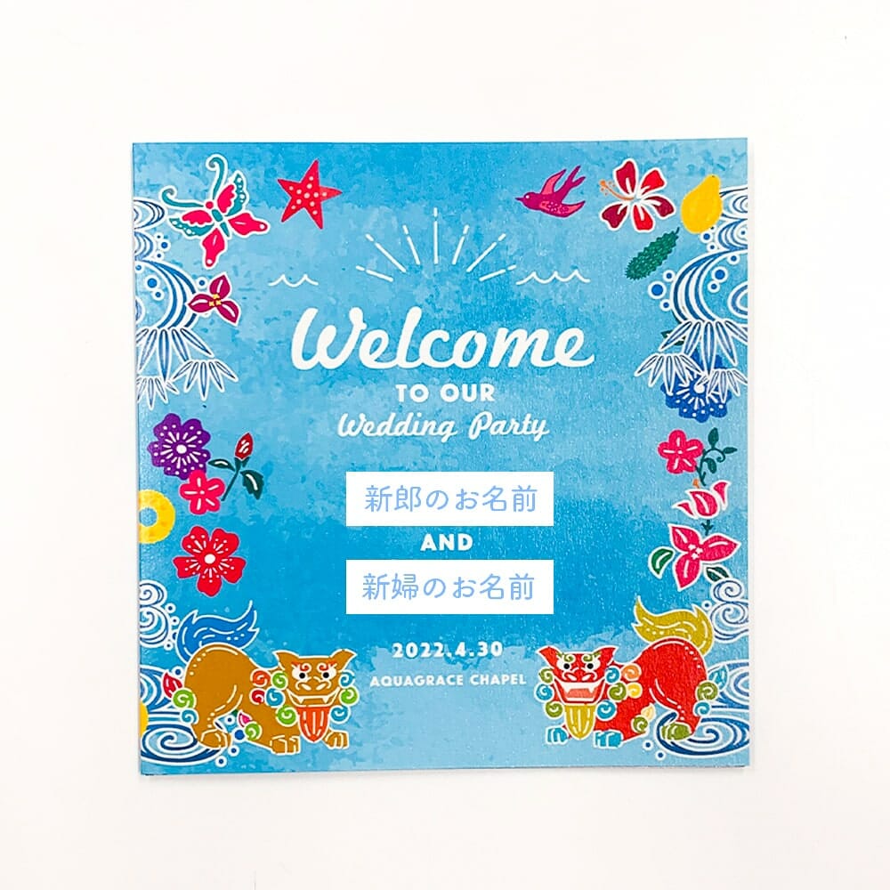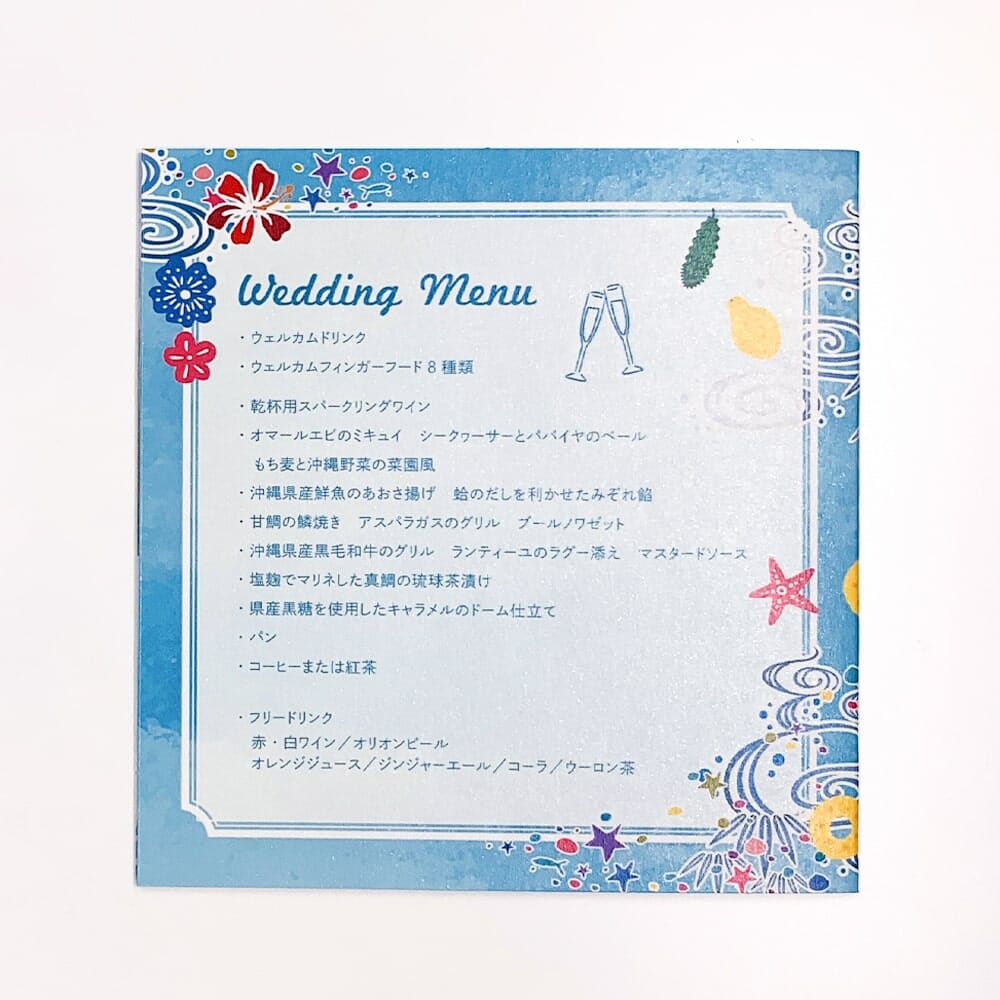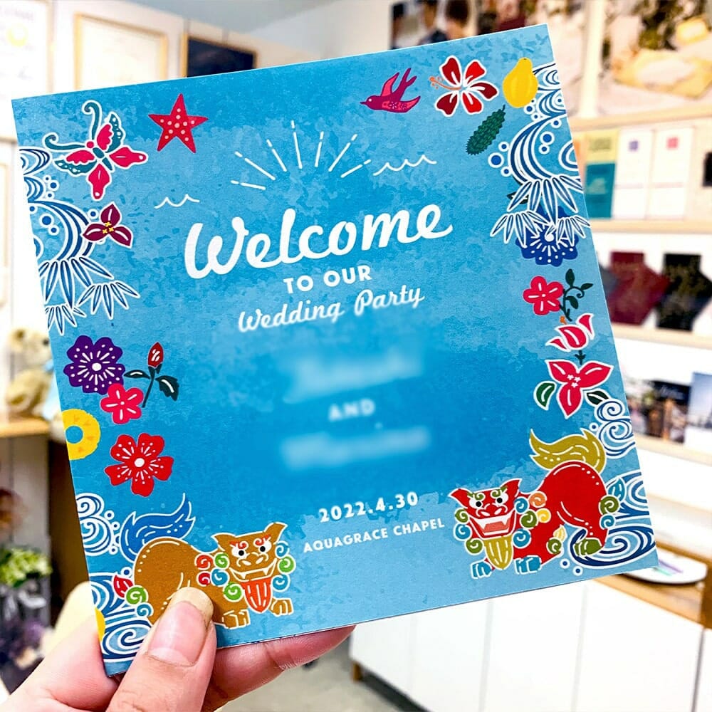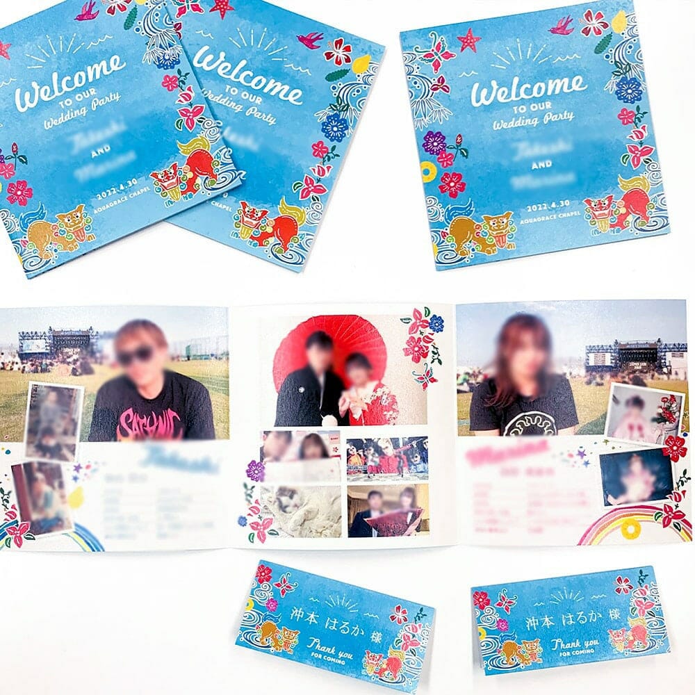 式場のブルーにあわせて、さらに式場のある沖縄をテーマに、沖縄を代表するイラストをちりばめてお作りしました。