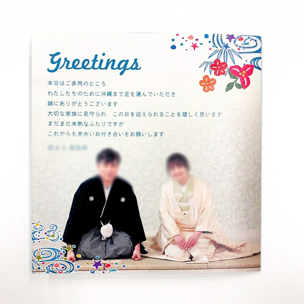 全面お写真の上にあいさつ文をお入れしました。琉球紅型模様をあしらって華やかにしてますよ♪和装で雰囲気ガラリもいいですよね!