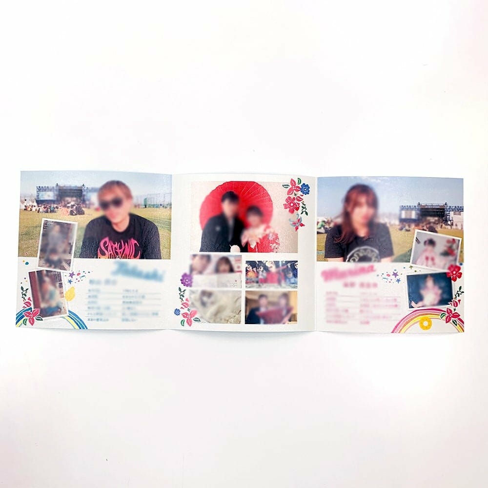 両サイドにお二人のプロフィール、中央にフォトアルバムの3つ折り仕様のレイアウトに。