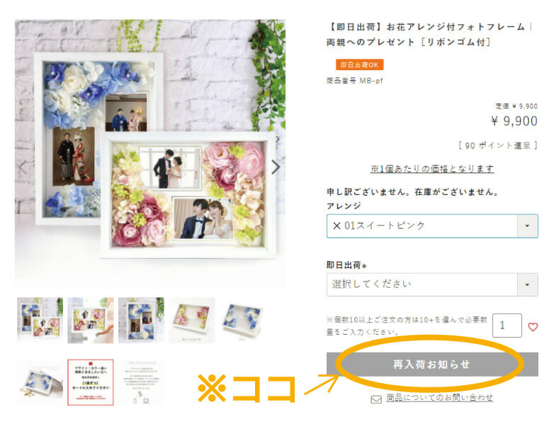 再入荷予定のある商品には、品切れの場合「再入荷お知らせボタン」が表示されるんです。