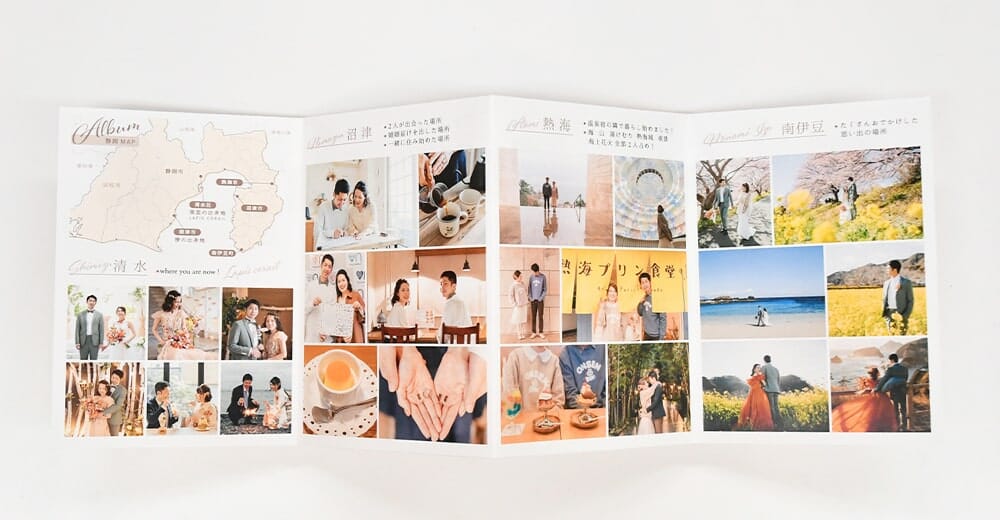 また、静岡の各地で前撮りをしたので、場所ごとにマップのように紹介したいというのもあり、冊子タイプではなんとなくスペースがたりなかったり、写真が小さくなってしまいそうかなと考え、一目で分かるように今回の見開きタイプにしました。