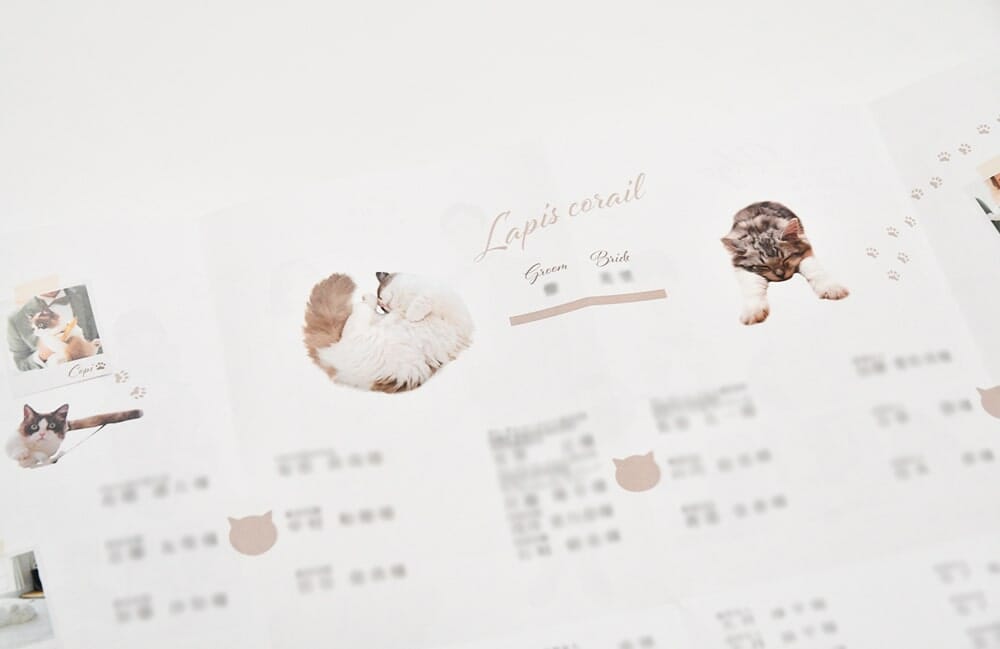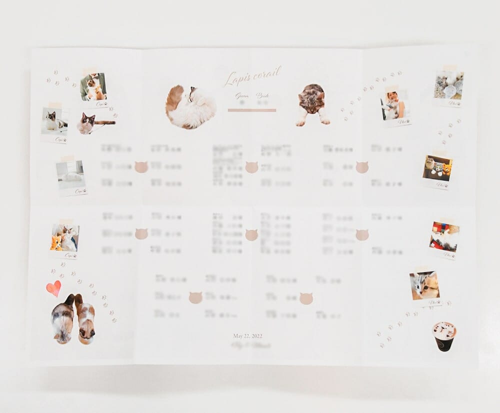 かわいい猫ちゃんショットと足形をちりばめて、キュンキュンする席次表に♪