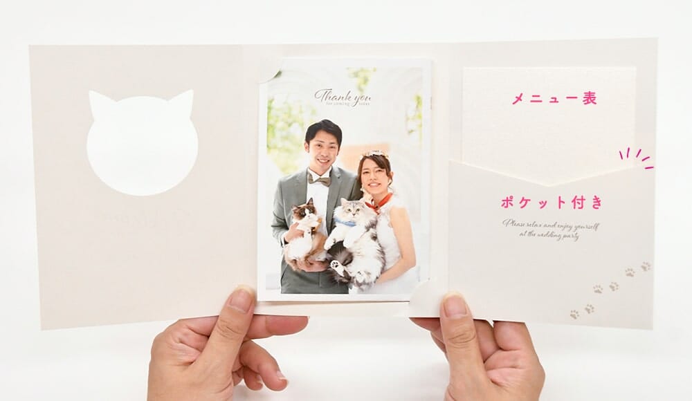 メニュー表の下部に小さな猫の型抜きをして、その数によってプレゼントが当たる!という、ちょっとしたイベント要素を取り入れたそうです♪ポケットがあることで席に着くまで誰が当たりか分からないワクワク感も演出できますよね♪