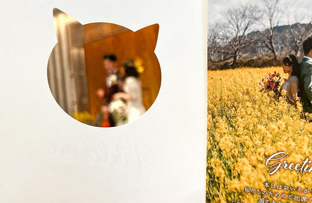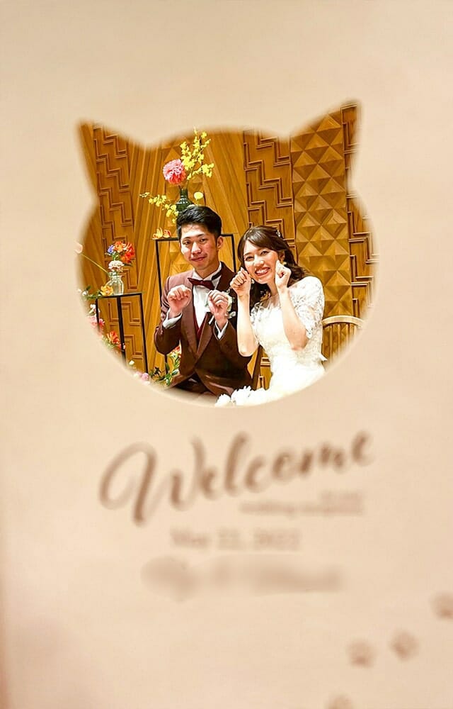 猫型に繰り抜かれた窓からおふたりのステキなお写真と、猫ちゃんの足跡も何だか猫好きを予感させますよね!