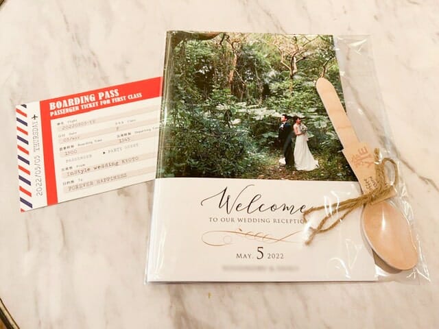 航空チケット風のアイテムもおふたりらしい…!