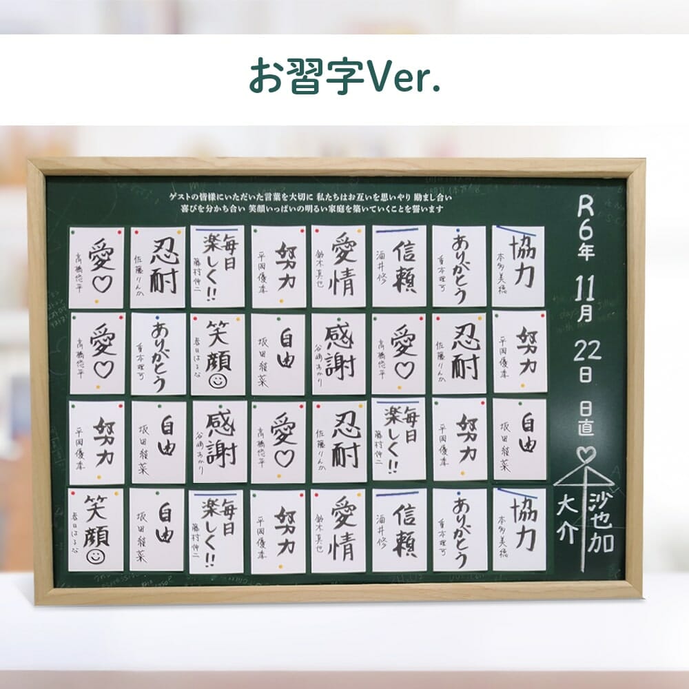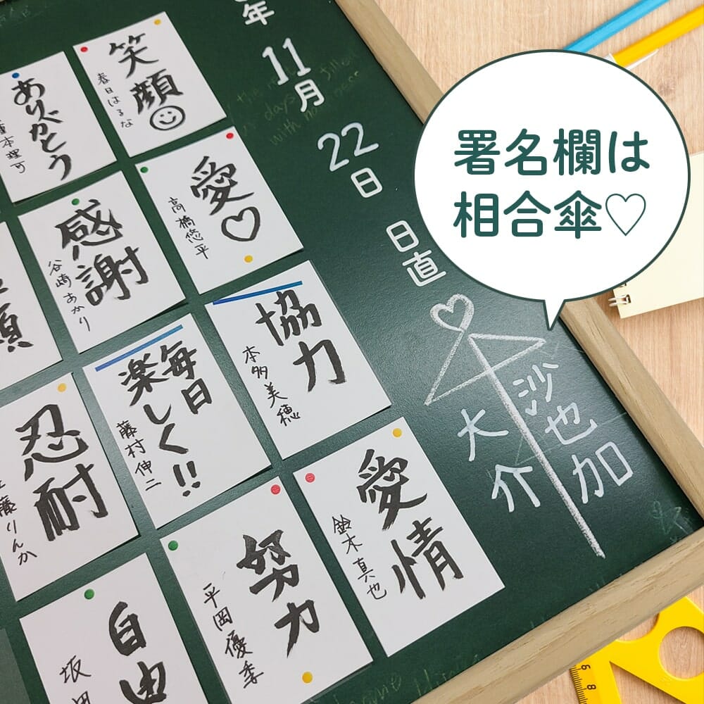 「結婚に大切なこと」をミニミニ半紙風カードに筆ペンで書いてもらい、黒板に貼っていきます!