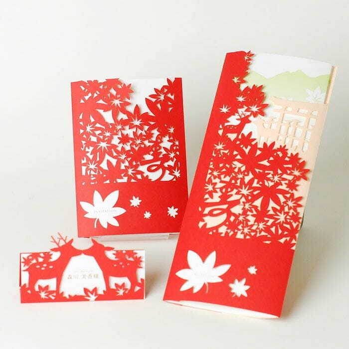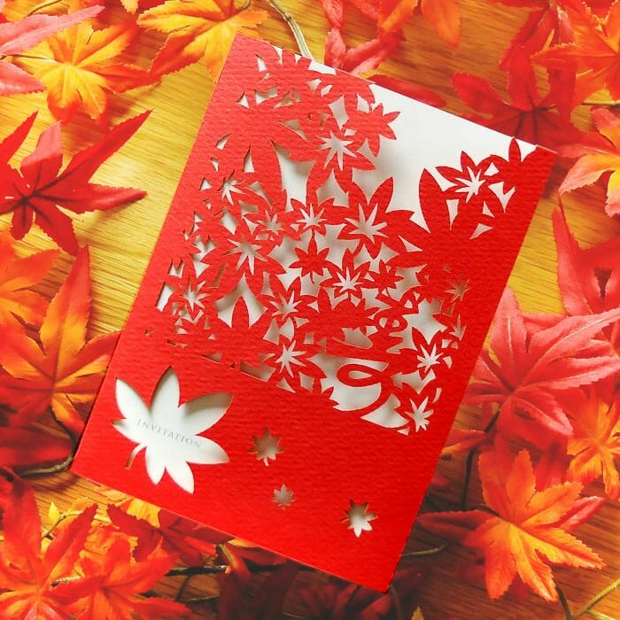 紅葉と、さりげなく「寿」の文字をデザインしたこちらの招待状。