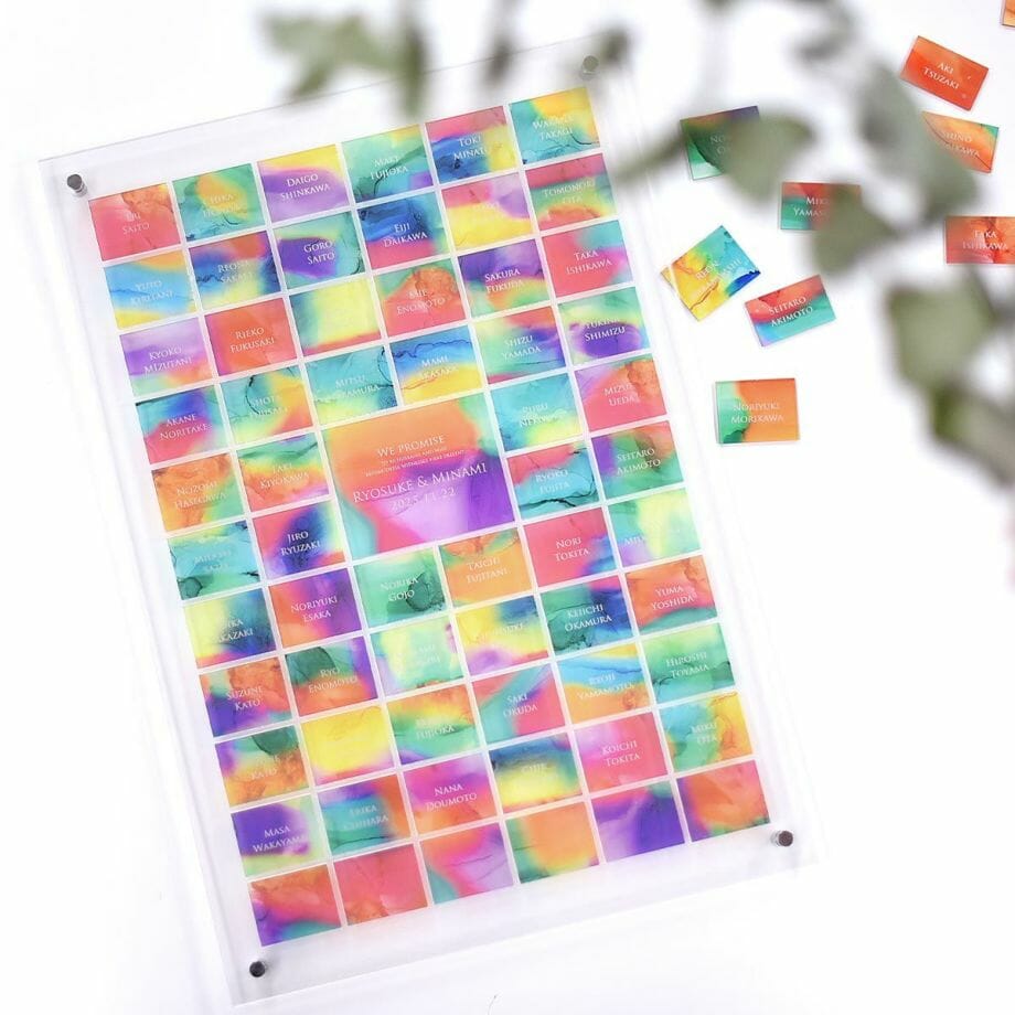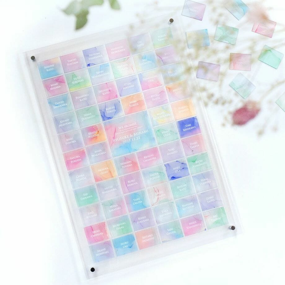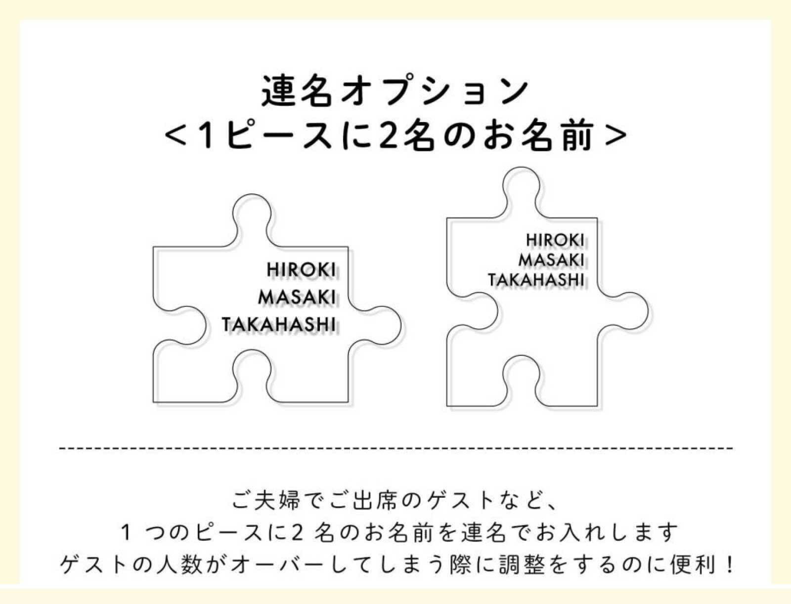 その理由も、仕上がりを美しくみせるため。周りからピースを自由にはめていただくと、最終ピースの空き部分はバラバラになるため、最初から新郎新婦様のプレートをセットしています。