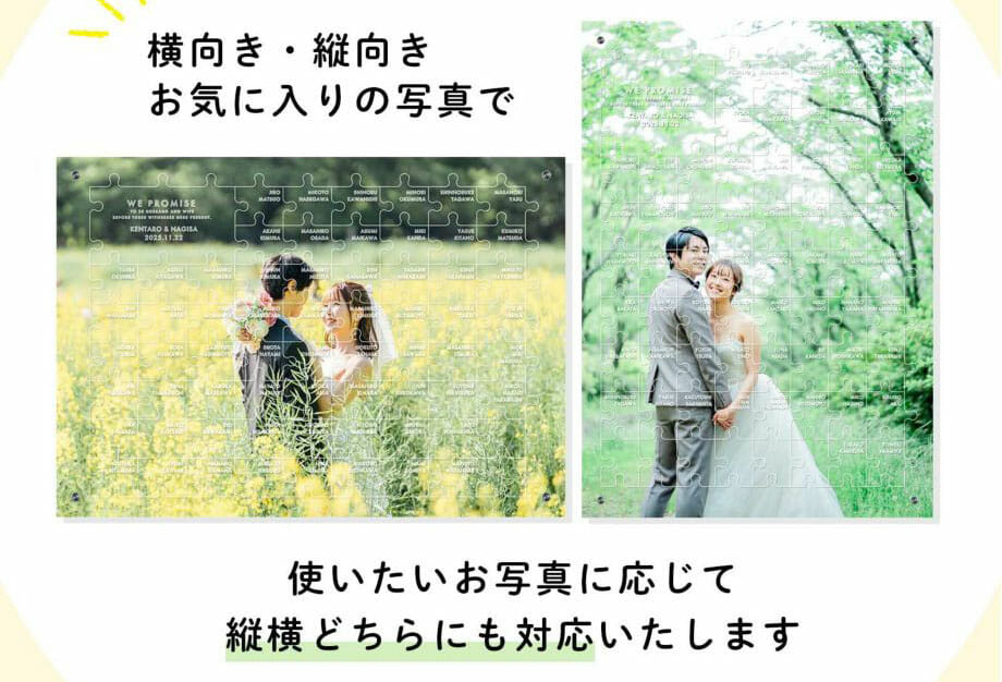 美しく仕上げるために考えられたパズルの結婚証明書。結婚式の日も、そのあと新居のインテリアとしてもずーっとそばに飾れる二人の一生の記念品です♡