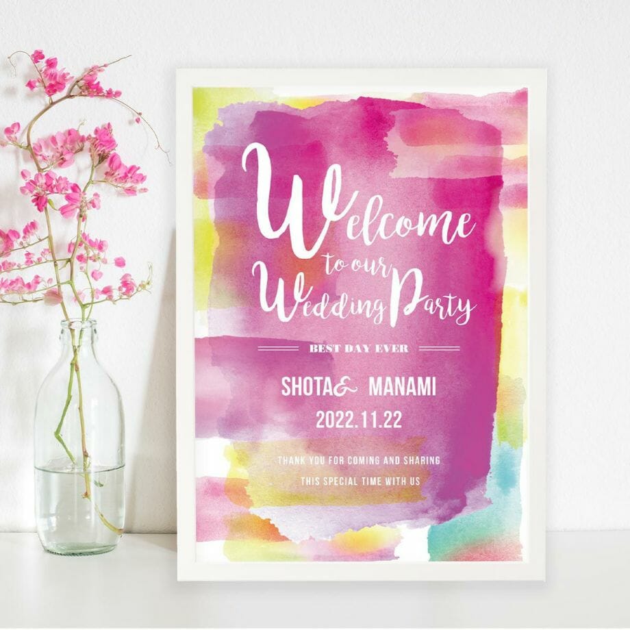 こちらはシンプルなゴシックフォントがクールなデザイン。背景カラーも「ネイビーブルー」「マスタード」「スカーレット」「ライラック」と、おしゃれな4色から選べます。人と違う個性的なウェルカムボードにしたい人におすすめ!