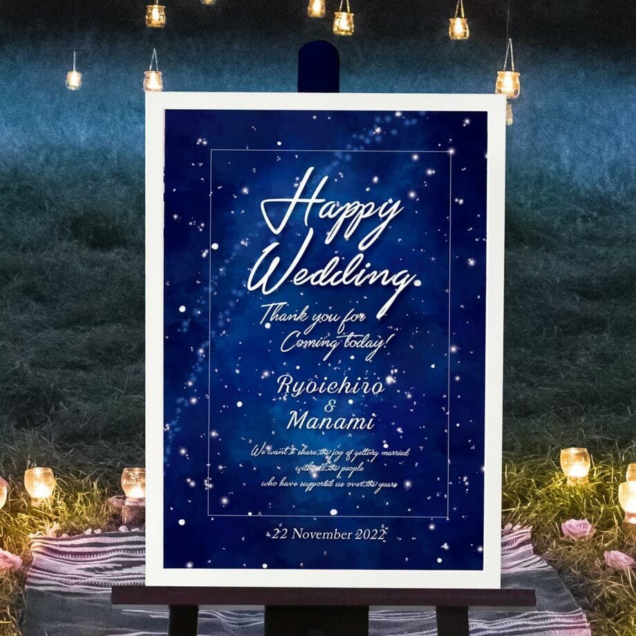 お名前部分には新郎新婦様それぞれ生まれ持った星座をあしらった星座付きウェルカムボード。キラキラ輝く星が散りばめられたデザインは星座や星、夜空がテーマのお二人にぴったりのロマンチックなナイトウェディングの結婚式に♡