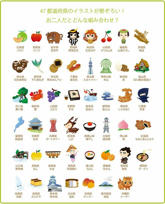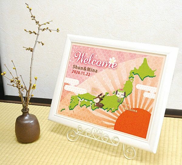 こちら日本地図をベースにお二人の都道府県を入れて作る遊び心たっぷりのウェルカムボード。出身地?出生地?お二人のイラストはどれ?
