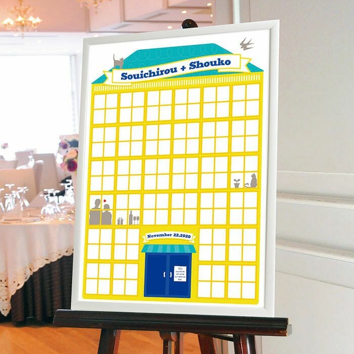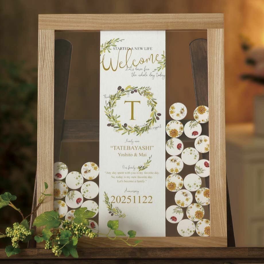 ウェルカムボードとしての役割だけでなく結婚証明書も兼用できるスグレモノ。楽しいゲスト参加型演出はおもてなしにも繋がります。