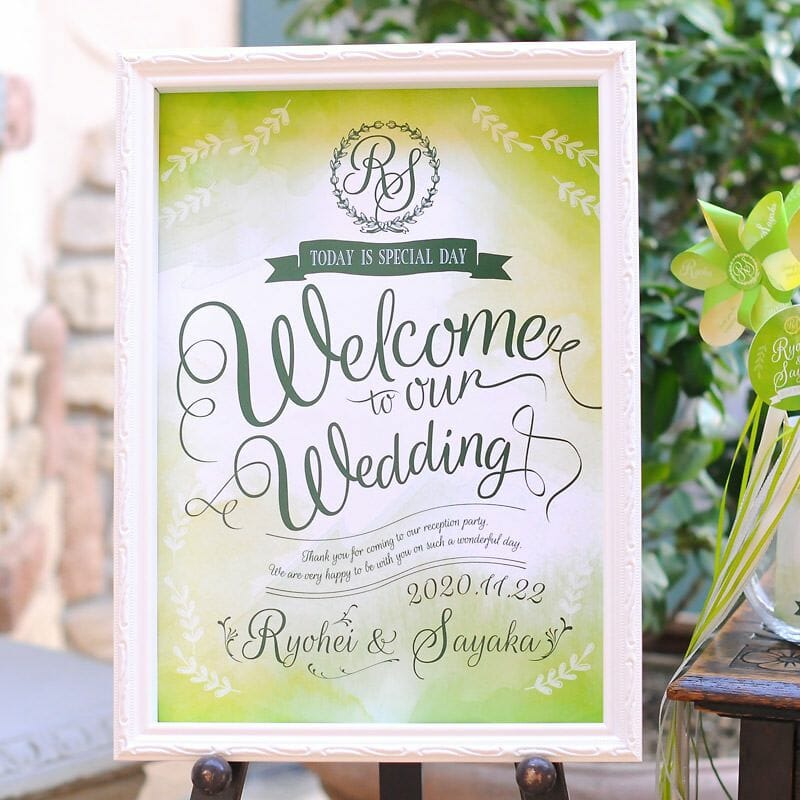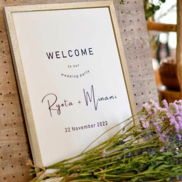 シンプルなデザインとおしゃれなフォントがお写真を引き立てて特別感たっぷり。くすみカラーがとってもおしゃれなウェルカムボードです。