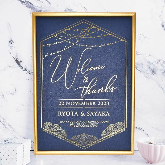 深みのある美しいネイビーにおしゃれなデザインを上品な金箔でプリント。ナイトウェディングにおすすめのウェルカムボードです。