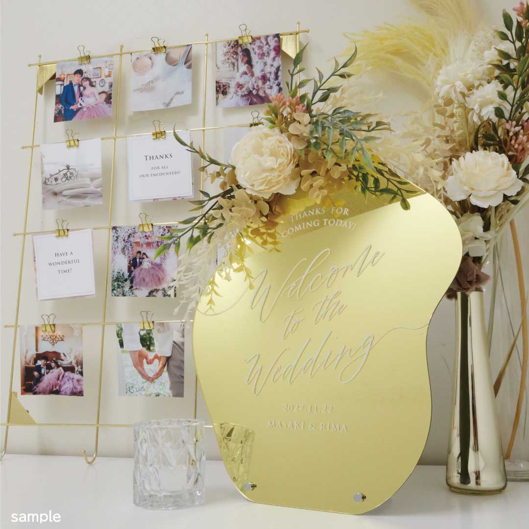こちらはアーチ型がおしゃれなアクリルミラーウェルカムボード。ゲストがセルフィーを撮影するフォトブースにも活躍!さらに式後も新居の寝室やリビングルーム、玄関などに飾りやすいカタチとサイズ感です。