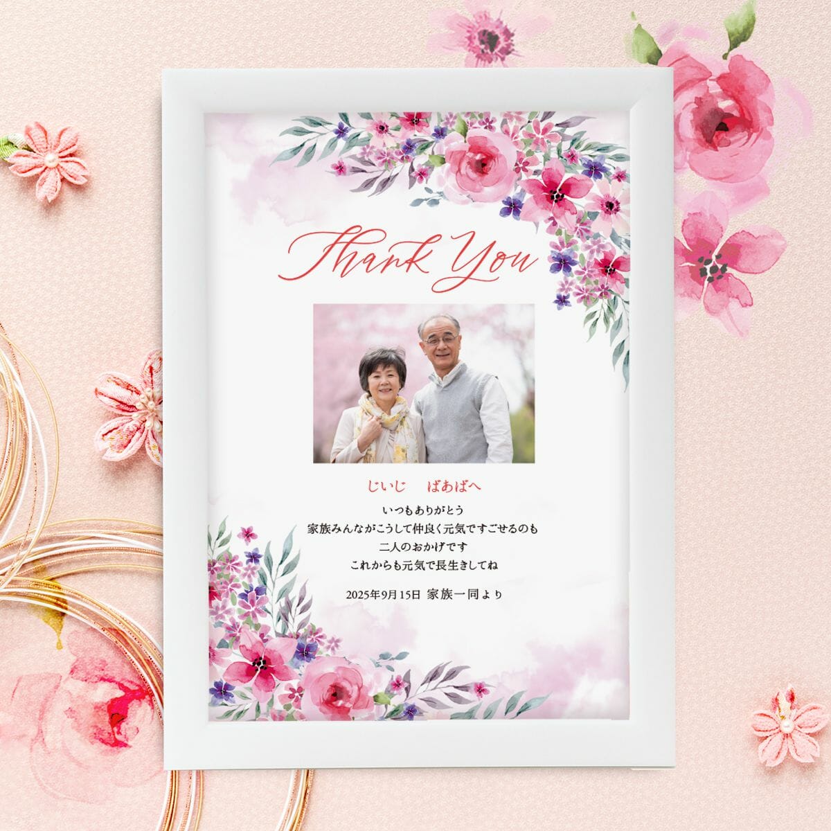 家族からのメッセージとともに、お写真を可愛いお孫さんとの写真や家族との記念写真にしてもOK!