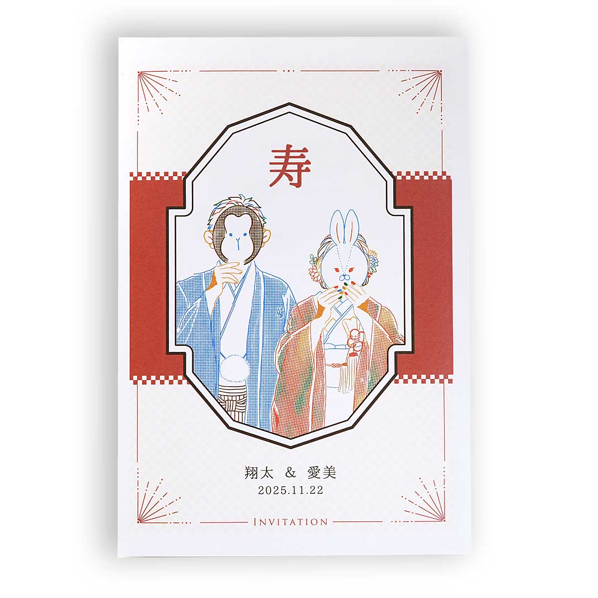 表紙は干支のお面をかぶった新郎新婦のイラスト!