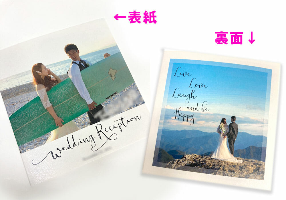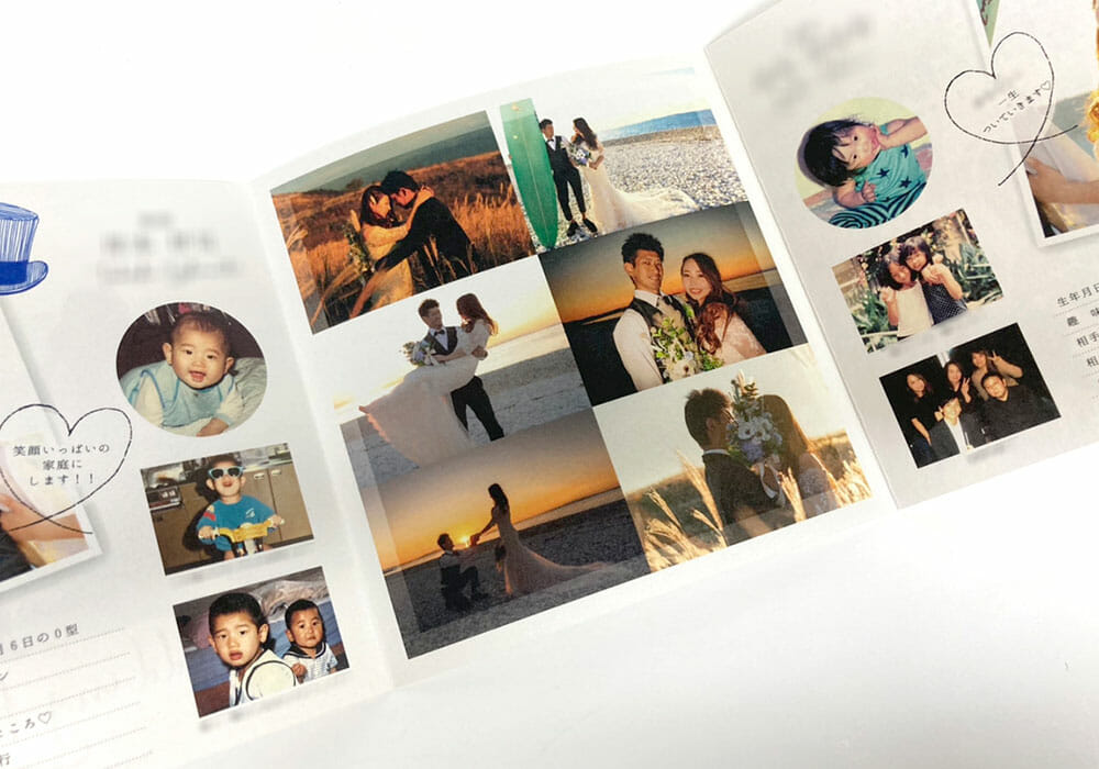 今回ご注文いただいたプロフィールブックは、折りたたむと正方形のコンパクトサイズになっています。席次表はついていなくて、写真をたくさん配置できる使用となっています。