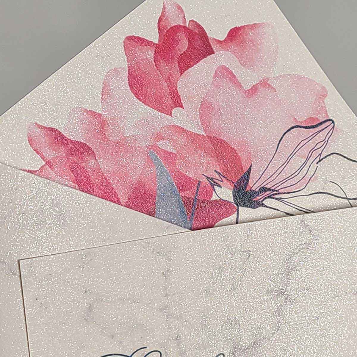 紙の中に細かなガラスフレークが織り込まれたファインペーパー。光に当たると 薄っすらと上品に輝くとってもきれいな用紙です。