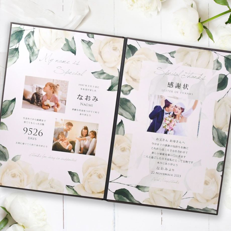 お写真が3点も入って、感謝の言葉やつけてもらった名前への感謝、生まれてから結婚までの日数など今までの感謝の気持ちをぎゅっとつめこんだ究極の子育て感謝状です。お写真3枚タイプはデザイン4種類からお選びいただけます。