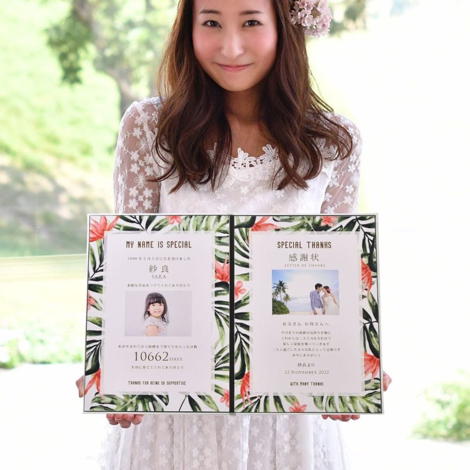花嫁の手紙として販売されているこちらの商品ですがリゾ婚、海外挙式のみなさんに両親プレゼントとして選ばれています。