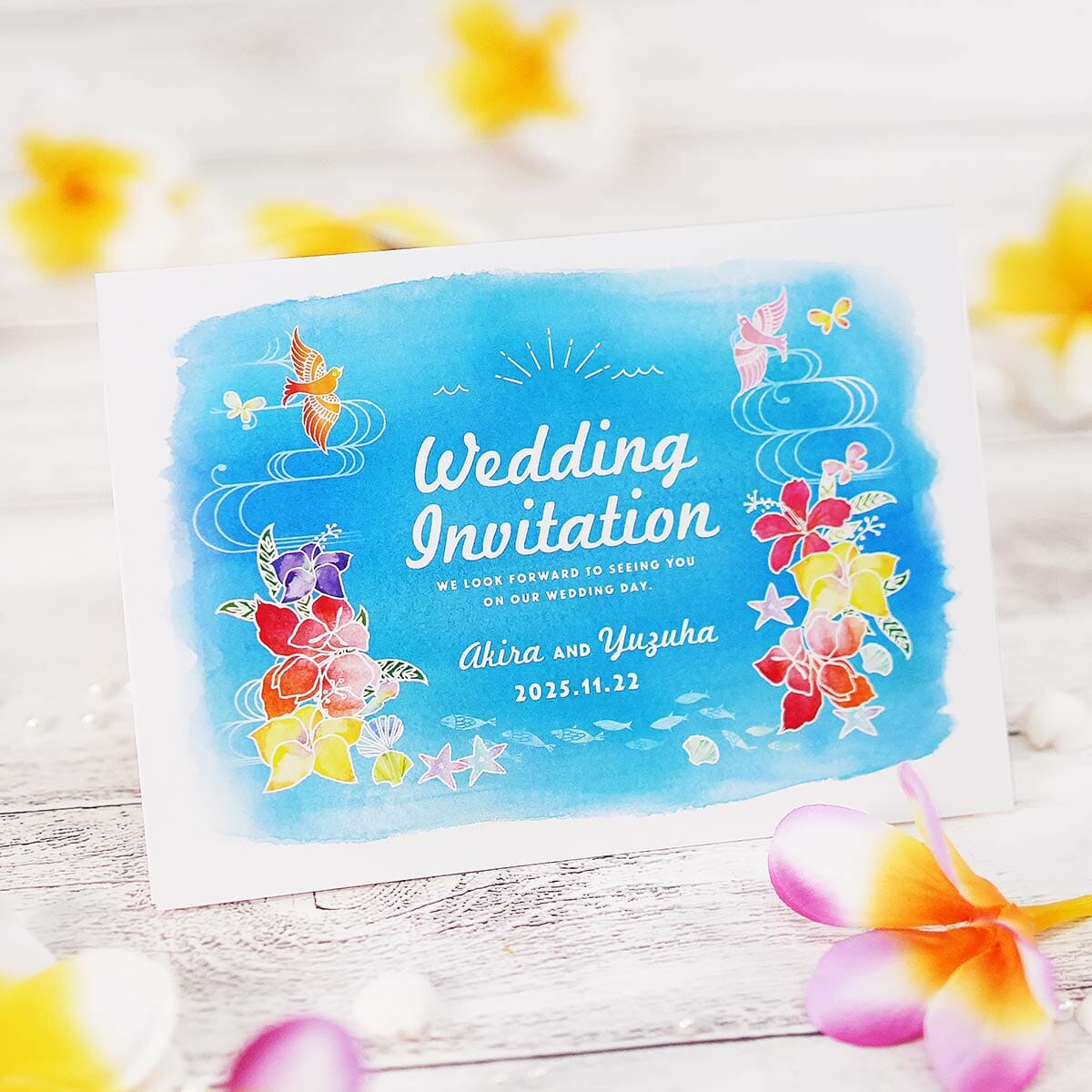 沖縄・宮古島・西表島挙式などにおふたりにぴったりな南国の青い海を感じさせる印象的なブルーとハイビスカス、琉球紅柄風のデザインで華やかな色合いの招待状です!