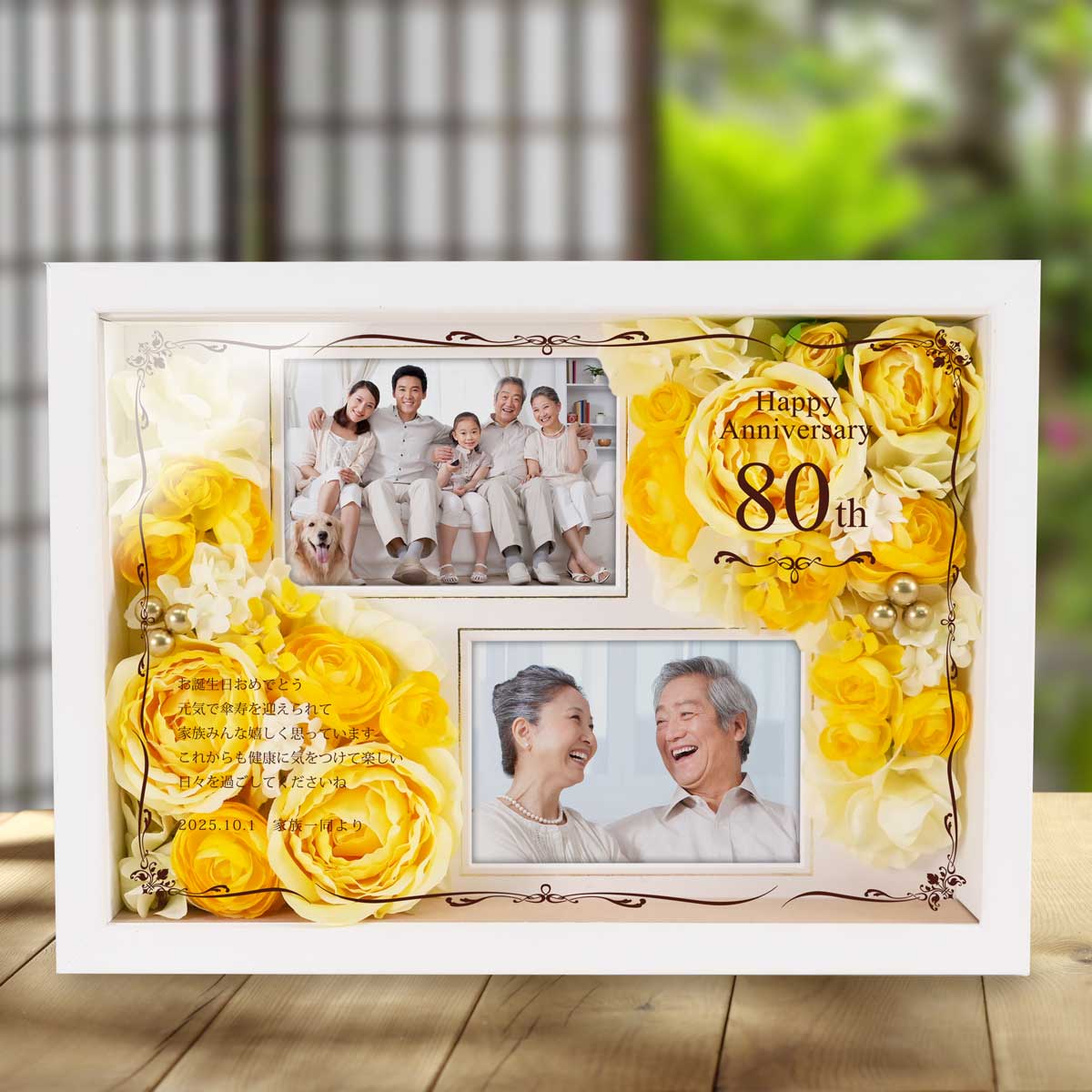 ファルベで人気の還暦、古希・喜寿祝いギフト「フォトフレームフラワー」に、傘寿・米寿祝いのテーマカラーにちなんだイエロー×ゴールドのお花アレンジVer.が新登場。
